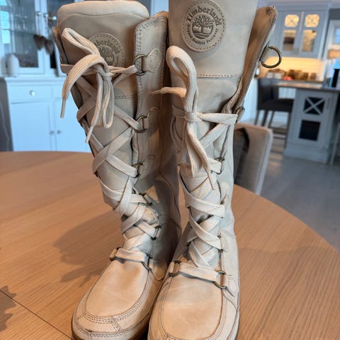 Timberland støvler i størrelse 40 med brun farge. Støvlene har lisser og en solid såle med godt grep. Innvendig er de foret med et mykt, lyst materiale som kan gi ekstra varme og komfort.
