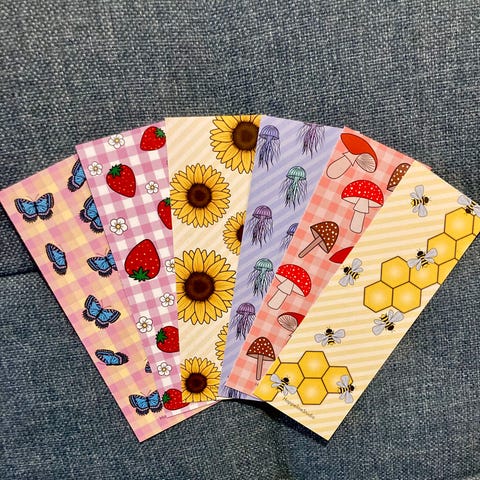 Hei! Jeg selger disse bokmerkene som jeg har designa/tegna. Har fler av hver :)