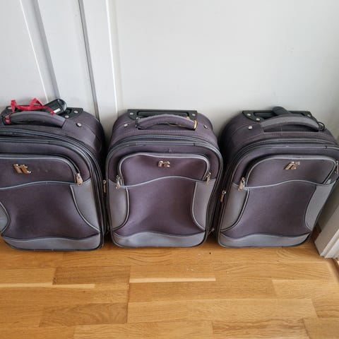 Koffert i størrelse M, den har en liten sprekk som er tapet på begge sider, og kofferten har 4 jul.