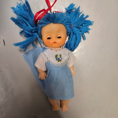 Vintage dukke med blondt hår, iført kjole med rutemønster og røde blomster, samt røde strømper. Dukken har bevegelige øyne og detaljerte armer og ben.