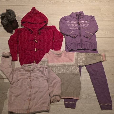 Barneklær i ull for jente i størrelse 104 med flere farger. Inneholder ulike plagg som bukser, gensere og strømper i forskjellige materialer og farger.