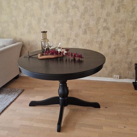 Solid og stort spisestue bord i mørk eik . Det kan gjøres mindre da det er to plater, som kan tas ut . 8 stoler i mørke brunt imitert skinn . Som dessverre noen av stolene har fått noe slitasje. Derfor kjøpte jeg disse stoltrekkene , som er avbildet , lys beige med brune detaljer . De kan vaskes , har vasket de flere ganger , og de er like fine . De selges rimelig i alle varianter hos Shein eller Temu . Jeg må dessverre selge , grunnet flytting til mindre leilighet. Bord og stoler er i god stand , men selfølgelig ikke nytt 😊