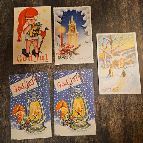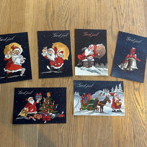 Et stort utvalg av brukte julekort og hilsningskort i forskjellige størrelser, motiver og farger.