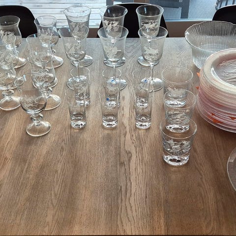 Magnor Glassverk shotglass med inngravert naturmotiv. Glassene er laget av klart glass og har detaljerte inngraveringer som forestiller dyr og natur.