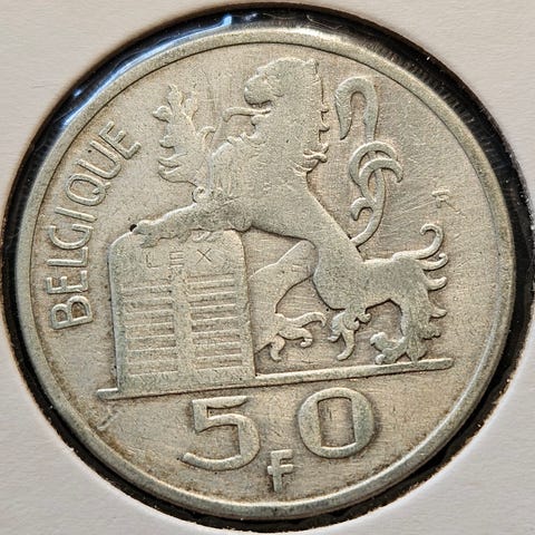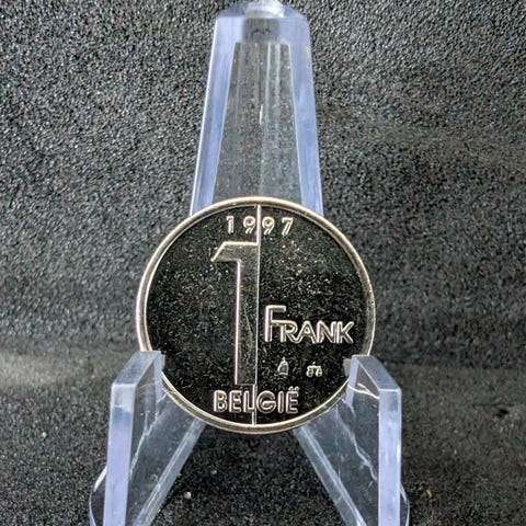 Belgia 1 Franc mynt fra 1989 med kongeprofil og kronet emblem. Mynten er laget av metall og viser årstall og nasjonalt symbol.