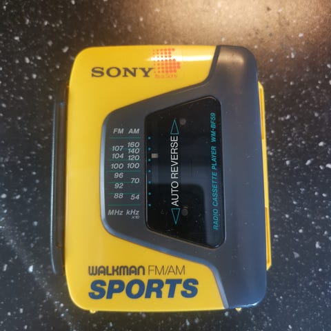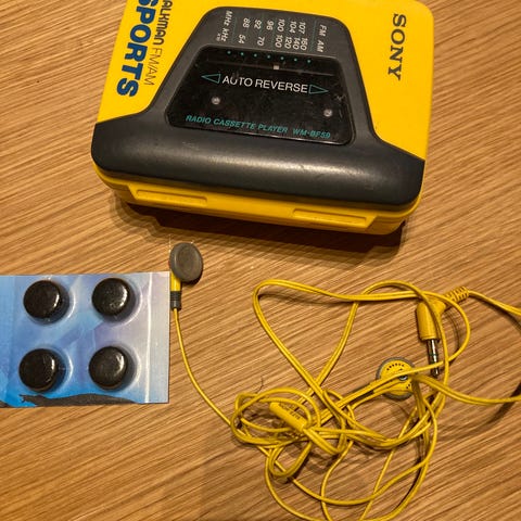 Sony Sports Walkman med kassettspiller og fm radio. Kassettspilleren fungerer radioen ikke. Mangler hodetelefonene og ødelagt radio tuner knapp.