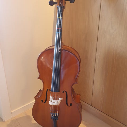 Cello 4/4 med etui og tilbehør inkludert, perfekt for nybegynnere. Instrumentet har en tradisjonell brun finish og leveres med alt nødvendig tilbehør som bue, kolofonium, stemmeapparat og endepinnefester. Celloen har ikke vært brukt på flere år.