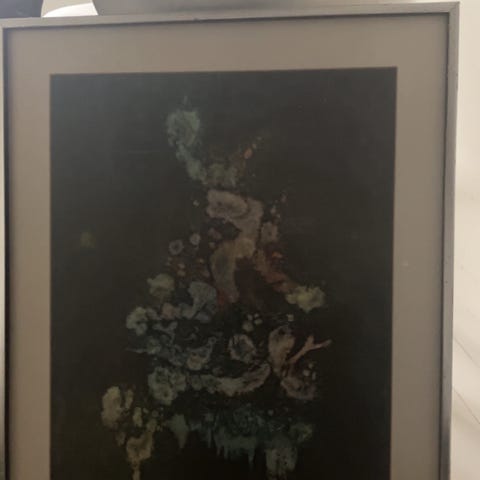 Motiv med skjelett og ulike silhuetter, trykt på papir. Signert og nummerert utgave 32/60 fra 2013.