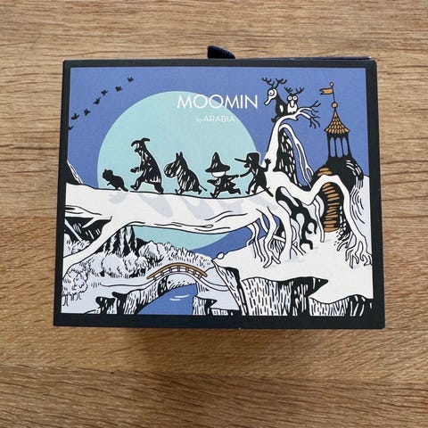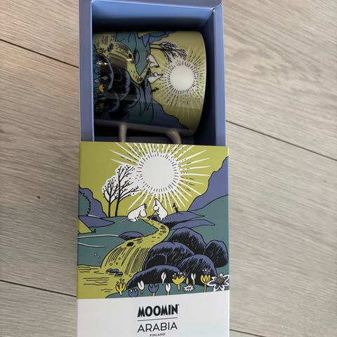 Arabia Mummi kopp med tilhørende eske. Koppen har fargerikt design med motiv fra Mummidalen, inkludert karakterer og landskap. Egnet til bruk som drikkekopp til varme og kalde drikker.