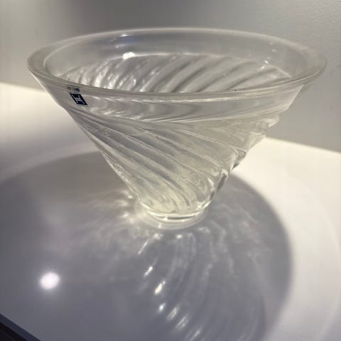 Hadeland Glassverk vase laget i klart glass. Vasen har en rund form med bred åpning og er egnet for dekorative formål, som blomsterarrangementer eller som et dekorativt element i hjemmet.