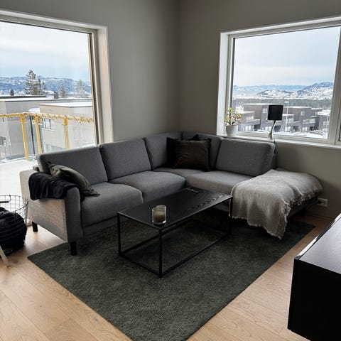 Grå toseters sofa fra IKEA. Type Klippan.