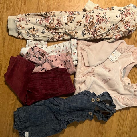 Liten pakke med klær fra Newbie og Name It. Pene klær som passer hjemme og som bruk i barnehagen, i farger som rosa, hvit og blå.