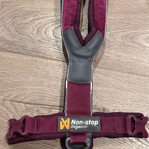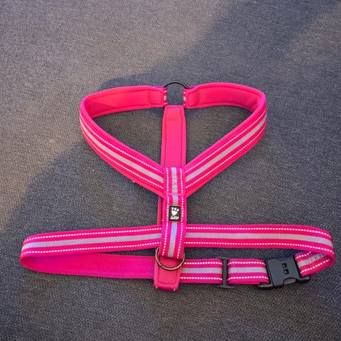 Rødt dekken har knute på strikken som skal være rundt bakbena fordi det satt stødigere på hunden sånn.