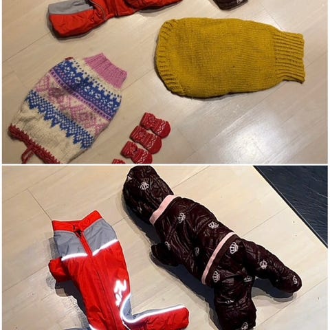 Hurtta Vinterdekken til hund i størrelse 33, en i blå og en i rød farge. De har fuskepelskant og mykt for.