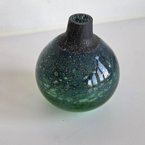 Tønder Glaskunsten sløyfevase av Joan Juhl Hansen med svarte striper, oransje, røde og gule flak, 16*8*3 cm.