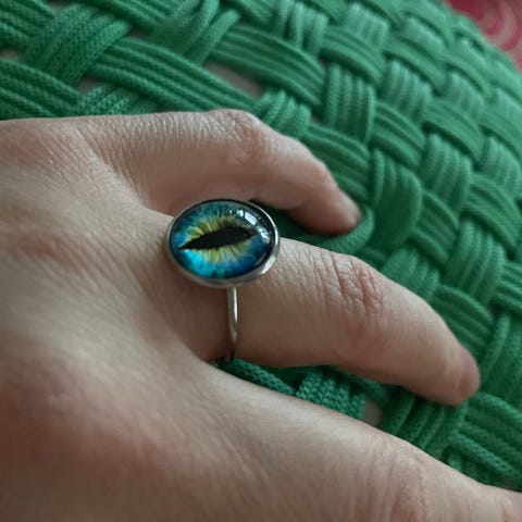 Selger denne flotte og helt ubrukte ringen med en fargerik, hypnotisk swirl-effekt i midten. Perfekt som et lite blikkfang i hverdagen, eller som gave!
