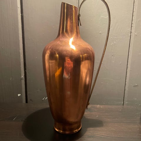 Ingen skader. Massiv kobber og messing. Veier 400gr. Høyde 10,5 uten hank. Diameter på midten er 12.