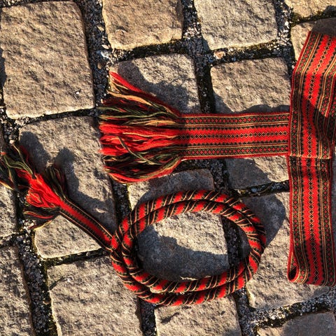Ubrukt belte. 8 cm bredt. 140 cm langt, pluss frynser.