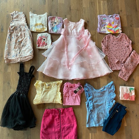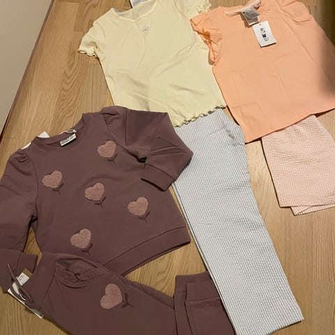 Fin klespakke i str. 110–116 med både merkeklær og håndlaget plagg. Mye bruk igjen. Kan selges samlet eller enkeltvis.