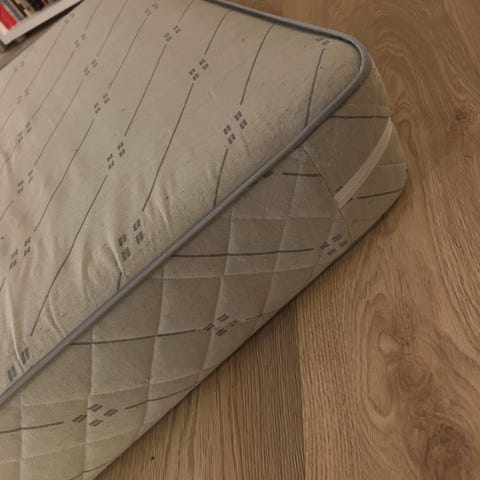 Jeg gir bort en reiseseng, en barnestol og to madrasser