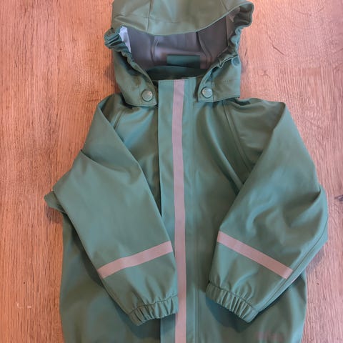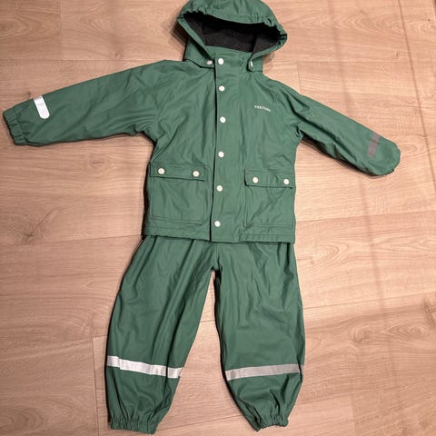 Buksen har ekstra forsterkning på knærne, justerbare seler og utskiftbare fotstrikker som holder den på plass. Jakken har avtakbar hette, stormklaff, elastiske ermer og refleksdetaljer for synlighet. Separate navnelapper i alle deler gjør det enkelt å holde orden i barnehagen.