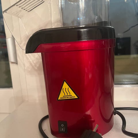 Rød elektrisk popcornmaskin for popping av popcorn. Enheten har en gjennomsiktig topp for overvåking av popcorn under popping. Kompakt design med strømledning for enkel tilkobling.brukt bare 3 ganger