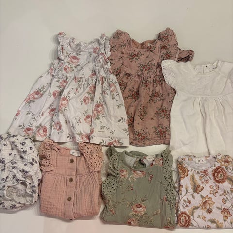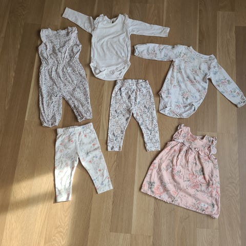 Newbie sett med body og bukse for jente i størrelse 74 med flerfarget design. Inneholder flere plagg med ulike mønstre og farger, inkludert bodyer med blonder og bukser. Laget for barn i denne størrelsen. Flere sett som kan kombineres.