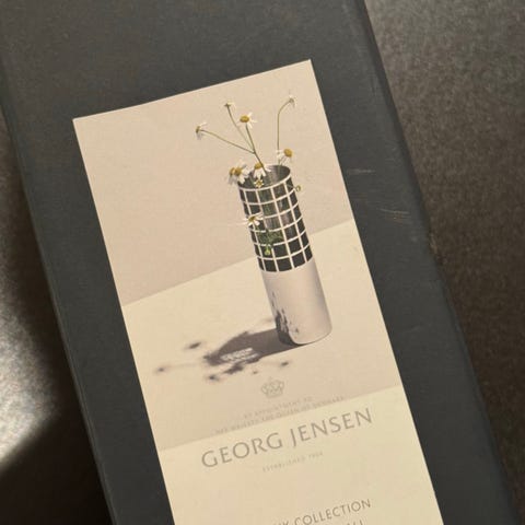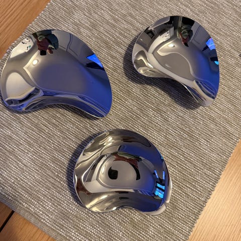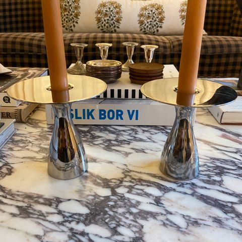 Georg Jensen dekorasjonsornamenter i metall med ulike design og funksjoner. Settet inkluderer flere dekorative gjenstander som kan brukes til pynt i hjemmet. Vet ikke om dette er Georg Jensen. Kan ikke noe med dette.