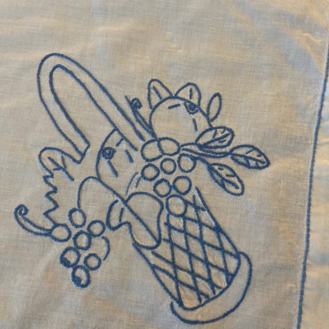 Brodert duk i ulike grønne farger samt selvkomponerte mønster😀