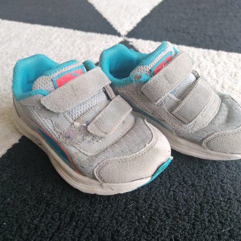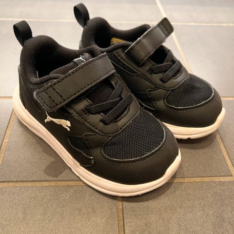 Puma sko for barn i størrelse 23. Skoene har en kombinasjon av farger inkludert svart, hvit, rosa og blå, med borrelås og snøring for enkel tilpasning og bruk.