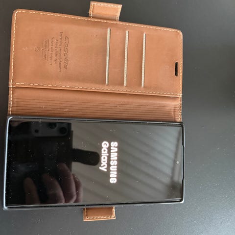 Samsung Galaxy S23 Ultra mobiltelefon med 256 GB lagringskapasitet. Enheten har en stor skjerm og flere kameraer på baksiden. Fargen er mørk, og telefonen er designet for brukere som ønsker høy ytelse og stor lagringsplass.