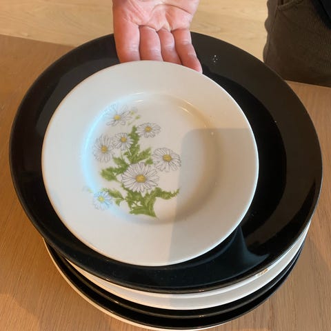 Div tallerkener gies bort mot henting i dag. Varierende størrelser og varierende bruksmerker på disse.