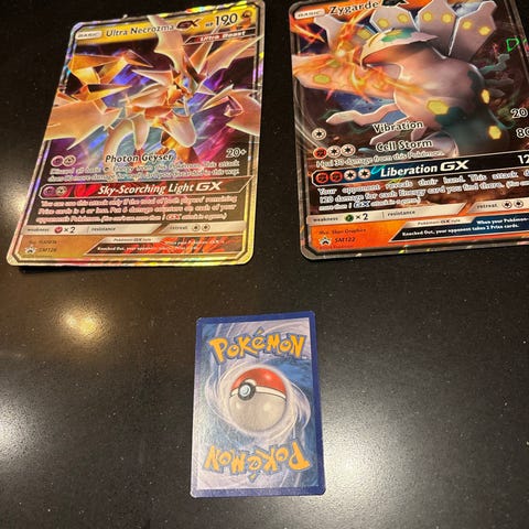 Pokémon GX samlekort med motiv av Pidgeot, Wigglytuff, Mewtwo og Gyarados. Kortene har holografiske effekter og tilhører GX-serien.
