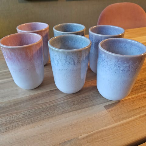H&M Home krus i keramikk i fargene rosa og rød. Krusene har hvit bunn og er egnet til bruk i kjøkken og til servering av varme og kalde drikker.