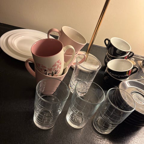 2 putetrekk, 4 skåler, 2 lyslykter, melkemugge, 2 glass, handlenett,