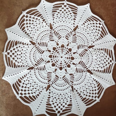 Duken er heklet med mercerisert bomullsgarn fra Solberg Spinderi, Nelly", tykkelse 12/4. Krok 1,25.