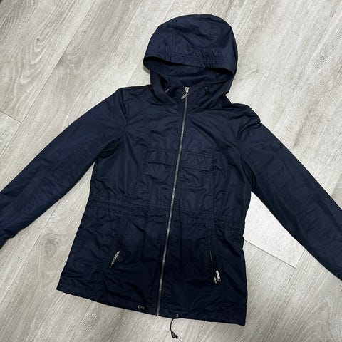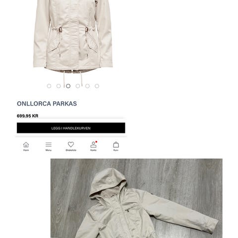 Praktisk og lett parkas i lys beige farge med hette. Jakken har snøring i livet og nederst, slik at passformen enkelt kan justeres. Behagelig å ha på og passer fint til både hverdagsbruk og tur. Kun brukt én gang og i veldig god stand, uten flekker eller skader.