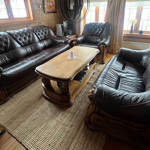 Stol og sofa i tre med blå mønstret stoff. Møblene har polstrede seter og ryggstøtter med armlener i tre. Passer til bruk på hytte. Pent brukt og stått på hytte tidligere. Må hentes på Ask, Ringerike