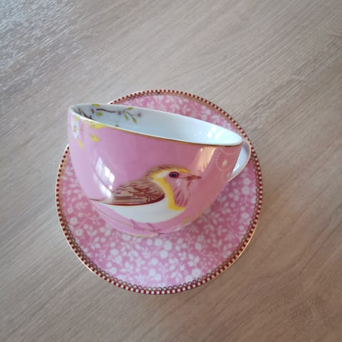PIP Studio kopp med dekorativt fuglemotiv. Koppen har et fargerikt design med detaljer av en fugl og naturinspirerte elementer. Egnet for daglig bruk til drikke.