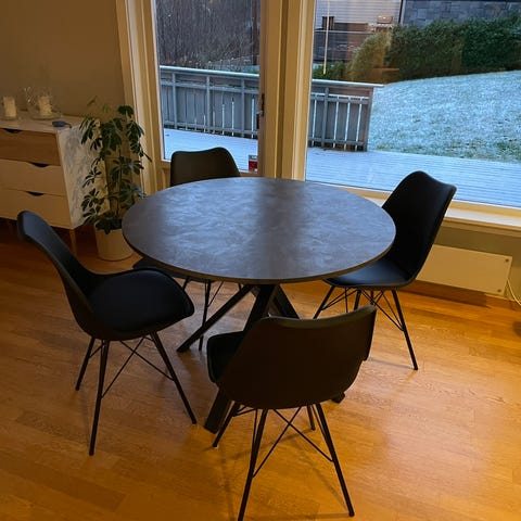 6stk spisestue stoler svart stoff selges . Kjøpt hos Bohus for ca 8 år siden .
