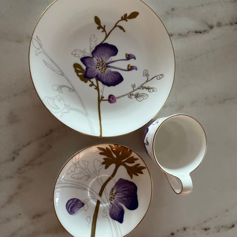 Da er der bare en lilla stemor høyhanket kopp, 27cl,med underskål i samme mønster, og en asjett 22cm, i samme mønster, igjen. Selges for 1000kr. Så er der en Magnolia middagstallerken 28cm. Selges for 500 kr. Se bilder.