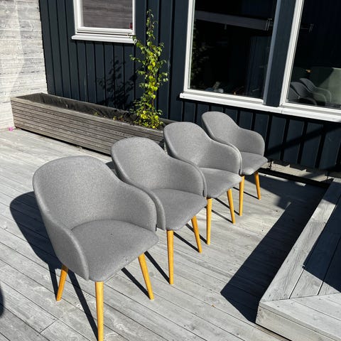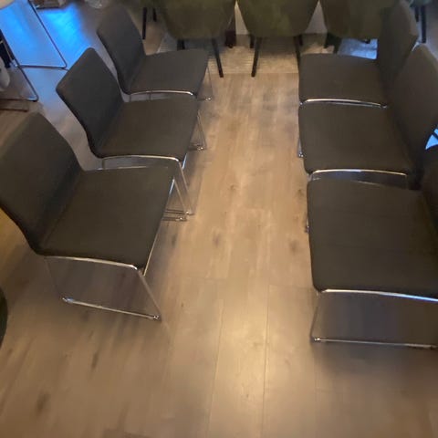 Selger seks spisestoler fra jysk. De er gode å sitte i og pent brukt. Ingen synlige merker. De er lette å rengjøre. Spisestolene blir grundig vasket før henting