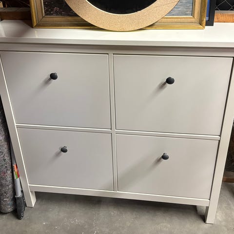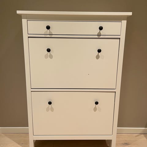 Selger HEMNES skoskap fra IKEA grunnet flytting. Har en skade foran, se bilde. Skaden har ingen praktisk betydning, skuffer fungerer som de skal.