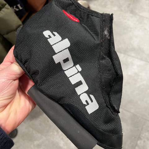 Alpina skotrekk til barn, str 31-32. De er klippet litt under (se bilde), for lettere å få ut snø som pakker seg der bindingen skal festes.