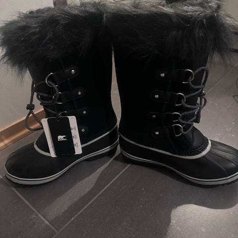 Sorel vinterstøvler i størrelse 36, rød farge. Støvlene har en vannavstøtende overdel og robust sort yttersåle for godt grep laget for å gi beskyttelse mot snø og kulde. Tykk innvendig filtsokk. Designet for unisex bruk, godt egnet for utendørs vinteraktiviteter.
