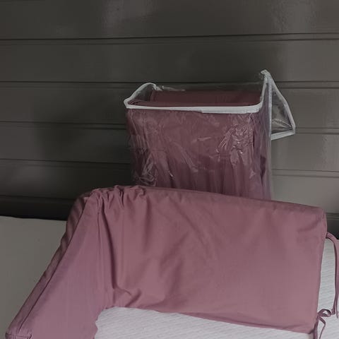 Laget av 100 % bomull med myk skumgummifylling, gir den lett polstring langs sengens kanter. Med snorer i hjørnene sikres en stabil montering, og det avtagbare trekket gjør rengjøringen enkel.