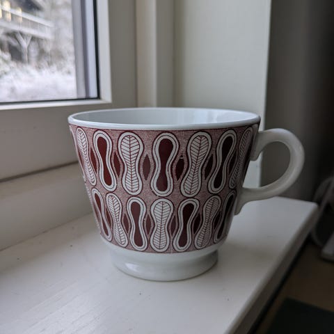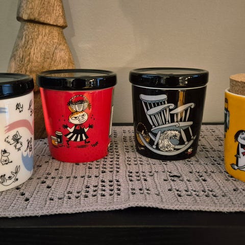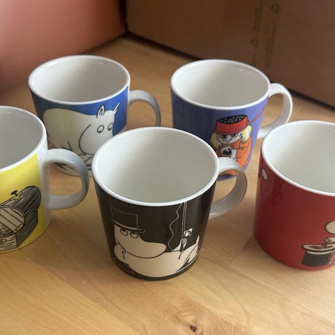 Arabia Mummitrollet barne-servise består av kopper, skåler, tallerkener og skjeer med motiver fra Mummitrollet.