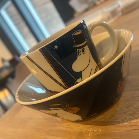 Arabia Mummitrollet Barne-servise med kopper, skåler, tallerkener og skjeer