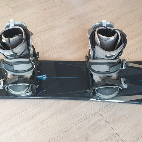 Brettet er godt brukt med synlige riper under. Skoene er str. 39,5