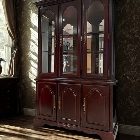 Vitrineskap i mørkt mahogni tre med glassdører